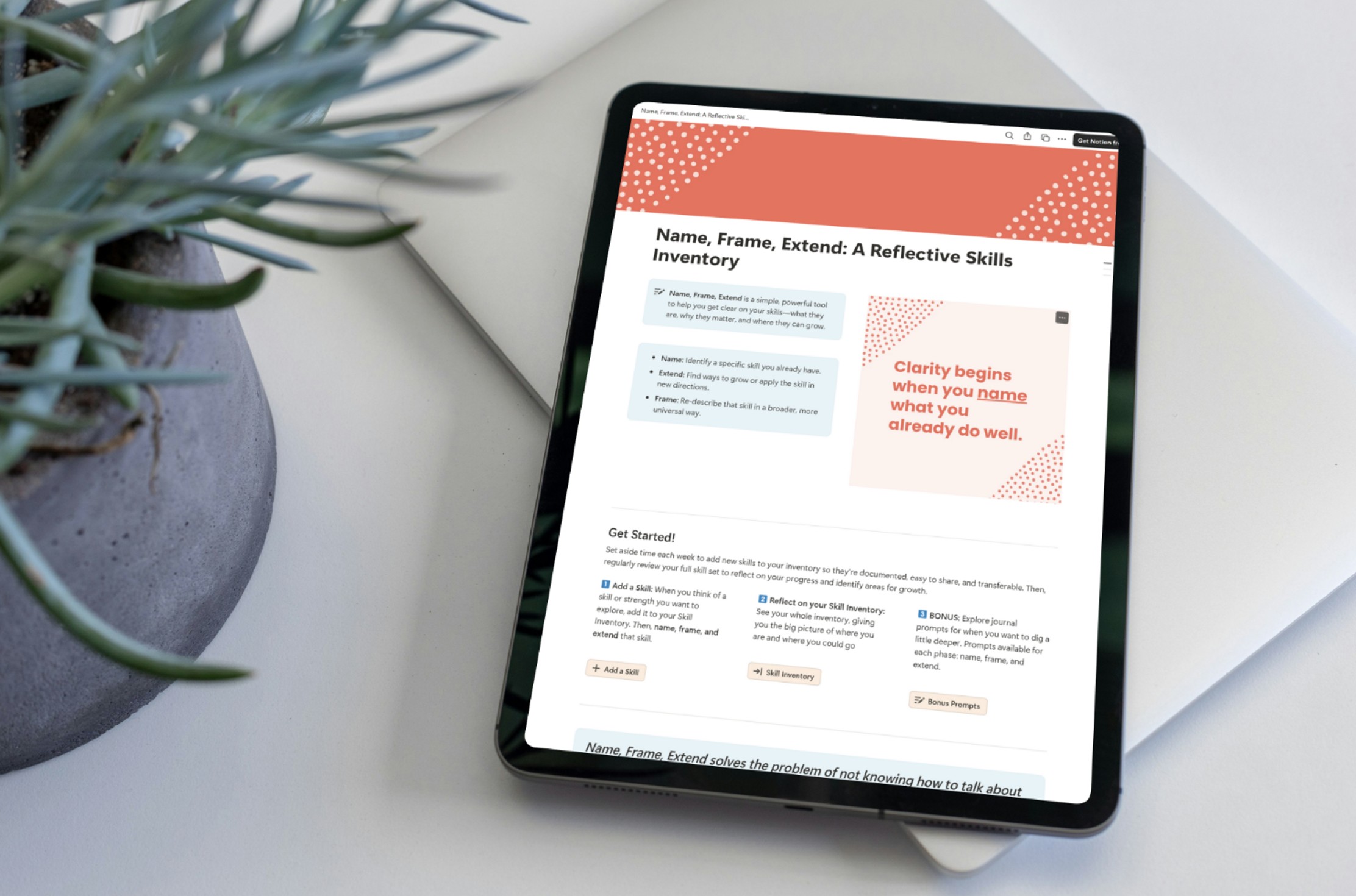 Name, Frame, Extend is a fast, simple framework for building career resilience in 10-15 minutes per week. It is a structured system for capturing strengths, building a skills inventory, and turning your talents into clear narratives.
